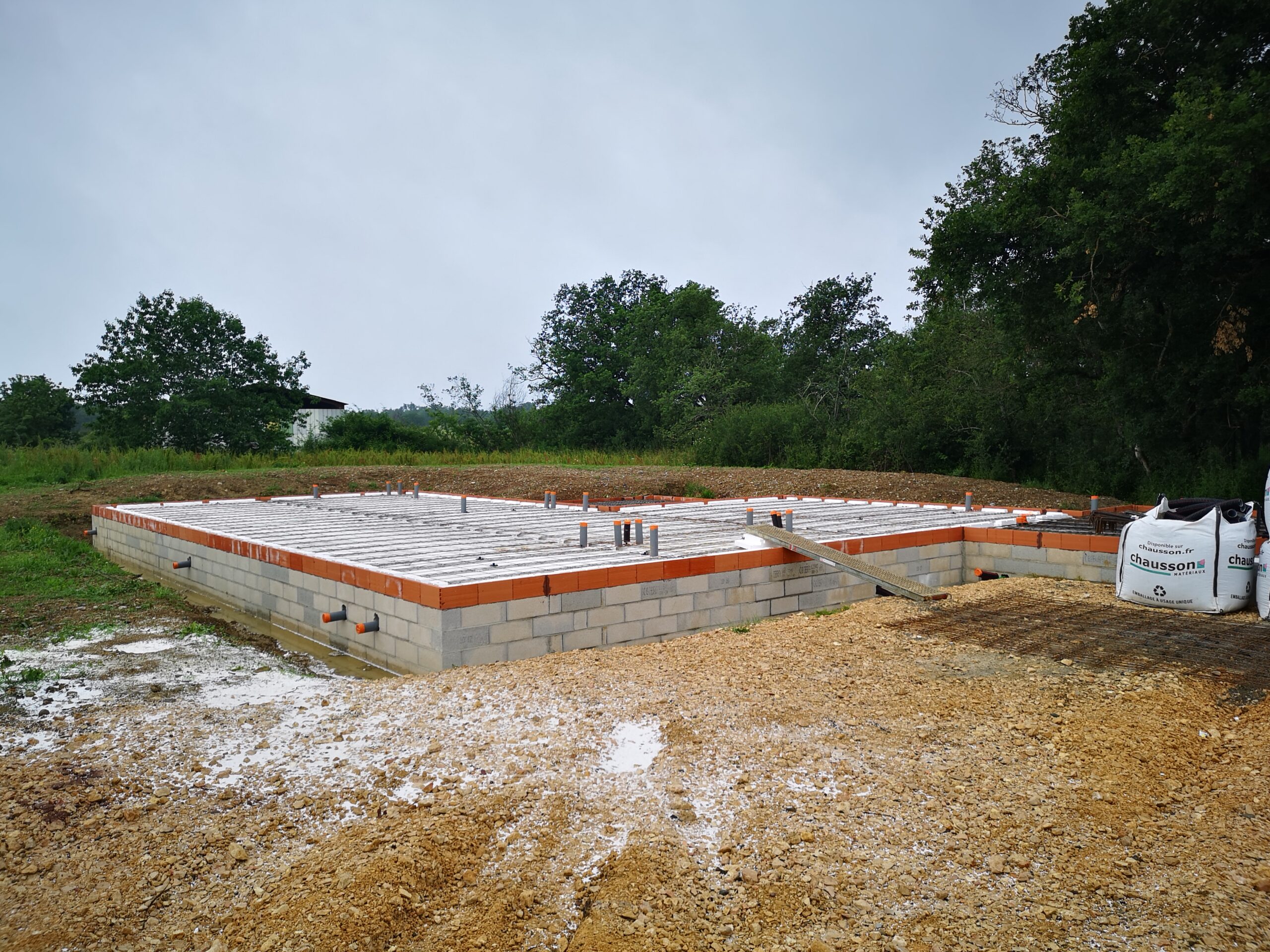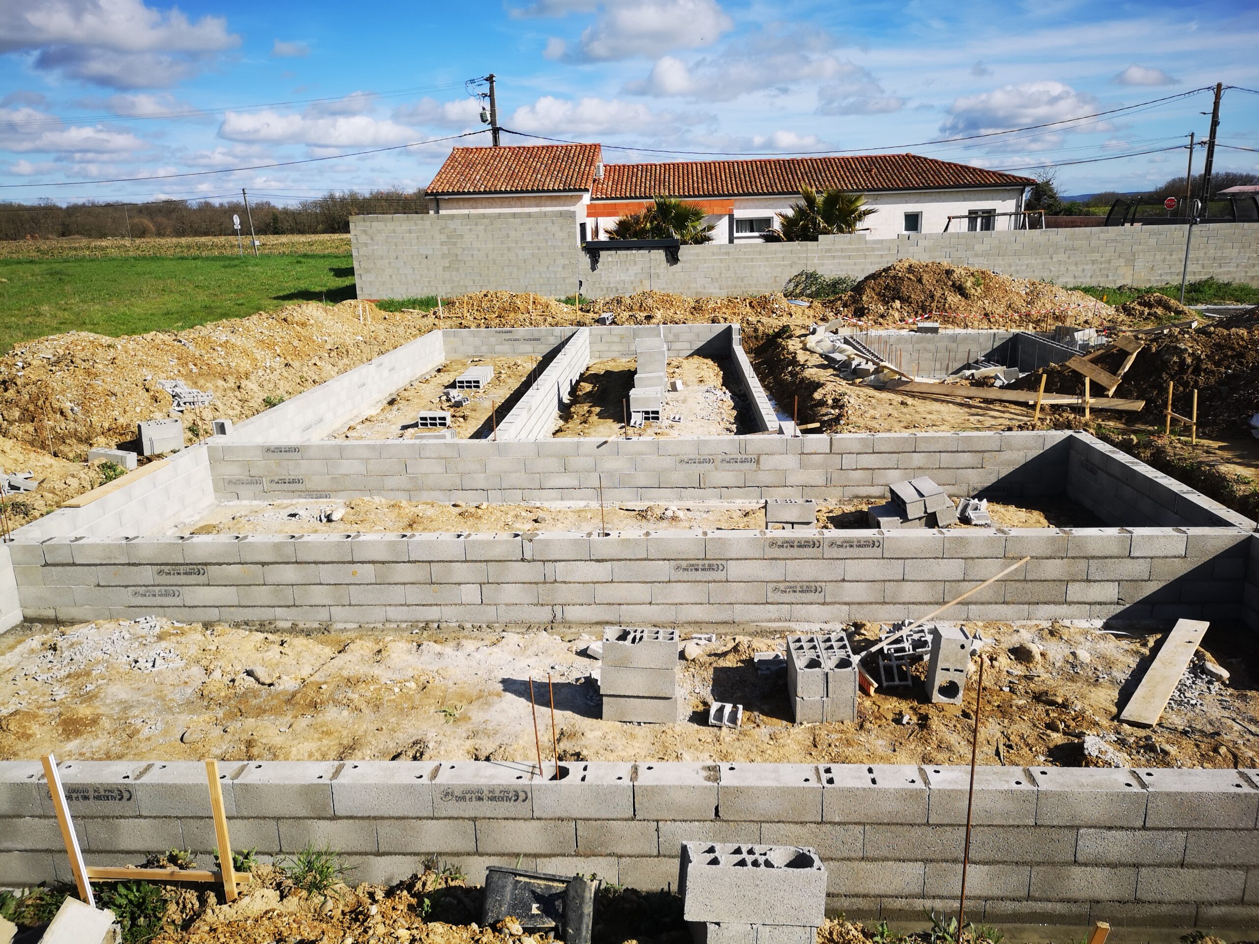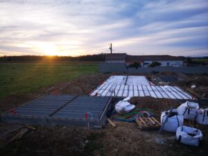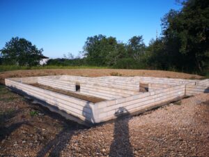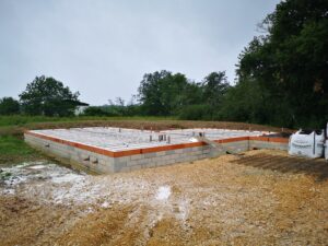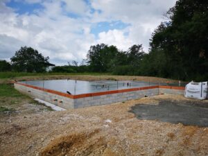 - Préparation du chantier : Préparation de la zone de construction, excavation et coulage des fondations en béton.
