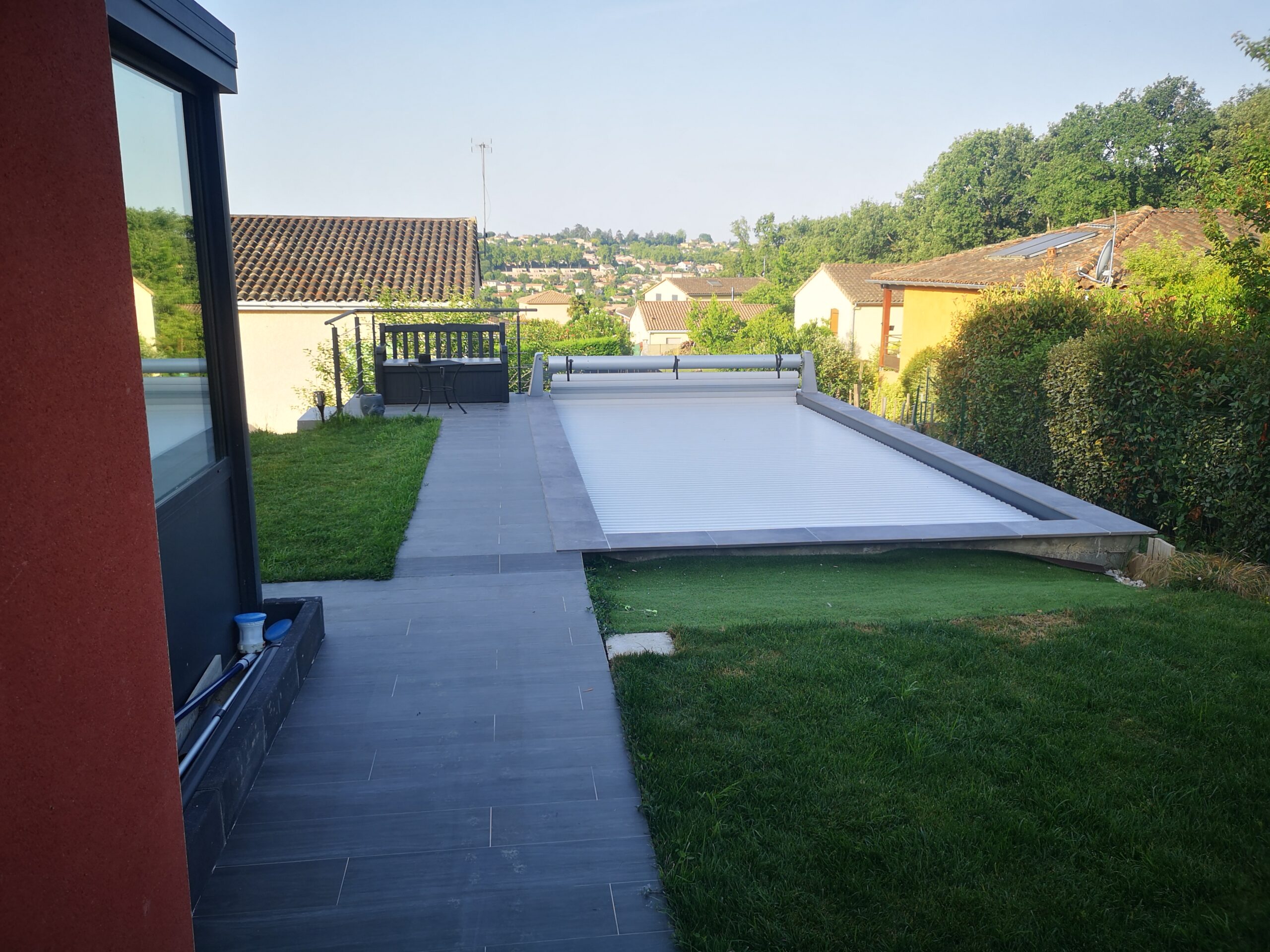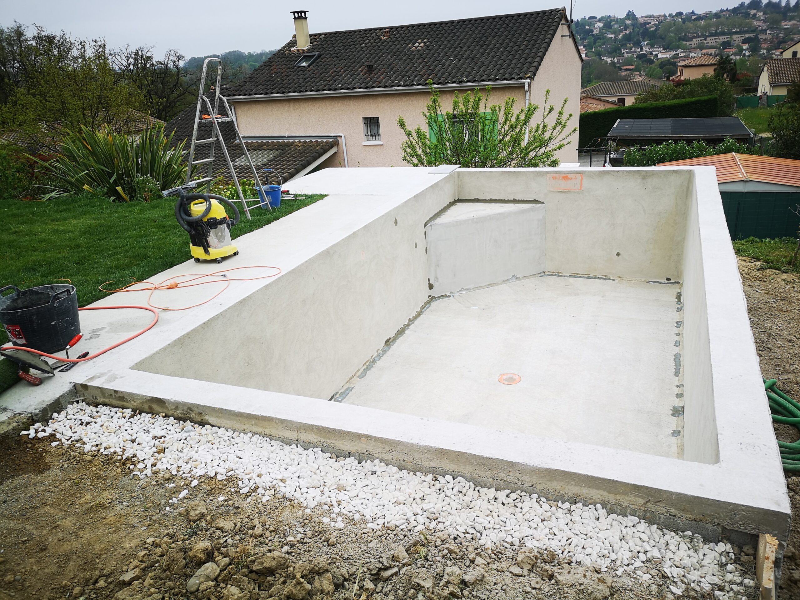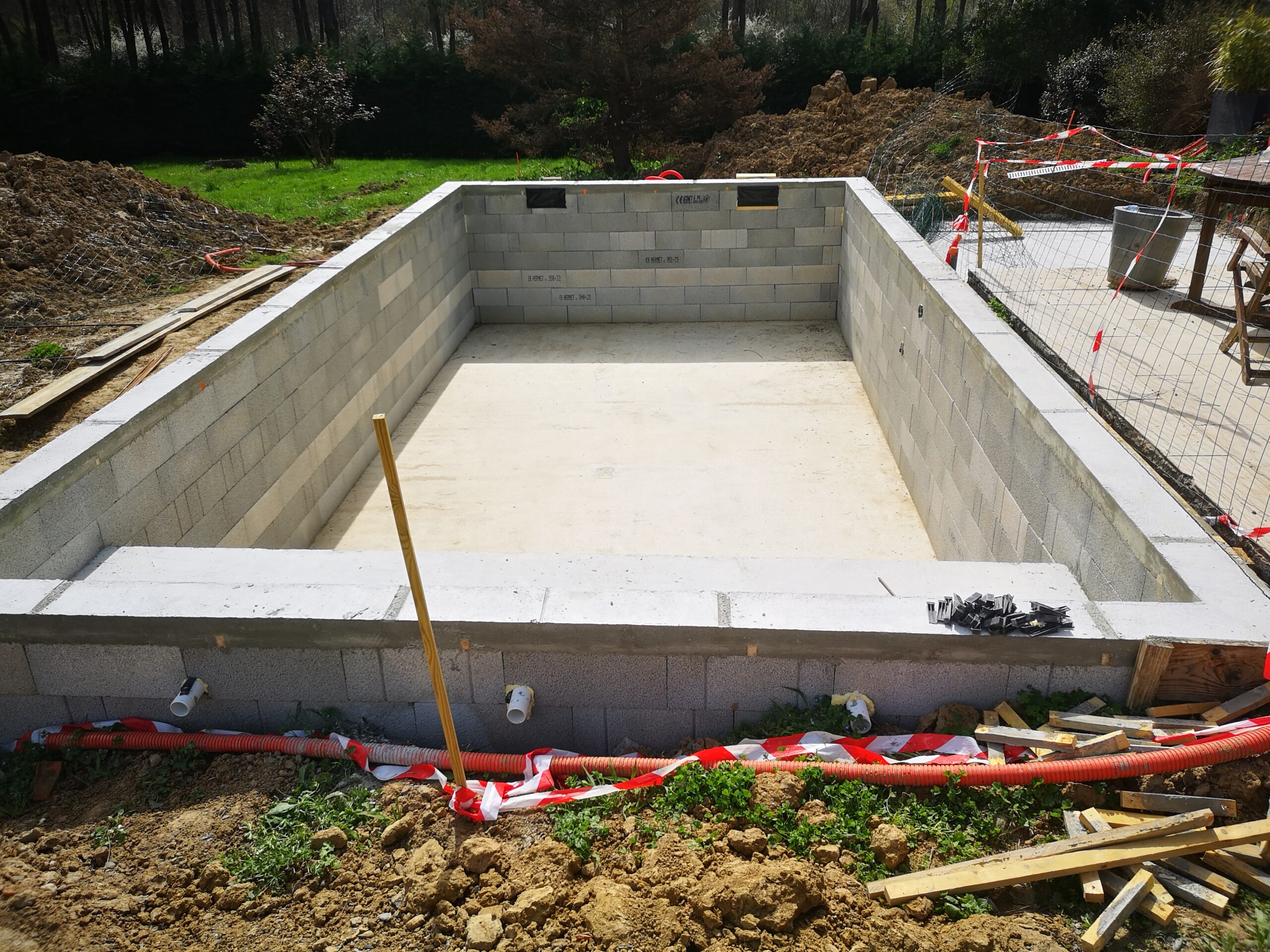 - Travaux de terrassement : Excavation, fondations et préparation de l’emplacement de la piscine.