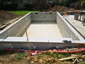- Construction de la structure : Construction du bassin avec différents matériaux (béton, acier, plastique), coffrage, bétonnage.